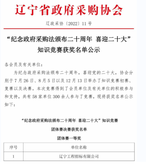 为纪念政府采购法颁布二十周年,喜迎党的二十大,促进行业健康发展,提高政府采购当事人执业水平,辽宁省政府采购协会举办了知识竞赛。公司选派的代表队在初赛、复赛、决赛等各环节均表现出色,凭借过硬的整体技术实力和综合能力,最终以优异成绩获得团体赛第一名。
