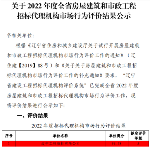辽宁工程招标有限公司以99.58分的优异成绩在2022年省房屋建筑和市政工程招标代理机构市场行为评价活动中获得第一名。在激烈程度逐年递增的竞争中,公司所得分数持续保持上升态势,连续第四年问鼎此项殊荣。